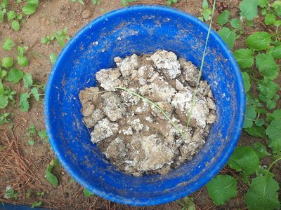 ¿De que manera natural podemos aportar calcio? El calcio se encuentra en todas las plantas en unas mas que en otras y sobre todo en el agua en algunos casos hasta demasiado (un ejemplo que pasa con las resistencias de las lavadoras cuando hay demasiado) (otro ejemplo un botijo el agua va pasando a través de la arcilla y al evaporarse va dejando una mancha blanca) Ellos introducen la tierra húmeda y luego la tiran otra vez es aquí donde sacan el calcio y otros minerales para su concha además del agua directamente, podríamos entrar en datos técnicos y pruebas para determinar si la cantidad es optima o también podría ser en exceso así como otros componentes que puede aportar el agua pero todo esto es para mas adelante, hemos quedado que primero hacemos una prueba y no empezamos a correr, una prueba barata con dos resultados, la maceta que veis aquí abajo ha estado bajo una malla sombreadora regándola con agua de pozo, calcio hay en exceso estuvo sembrada con las mismas semillas que hay a su alrededor, solo sobrevivió una planta y de calcio a tope si todavía les damos pienso compuesto con mas calcio los resultados serán fatales y si pretendemos que coman de la hierva que crece bajo la malla sombreadora el fracaso esta asegurado.